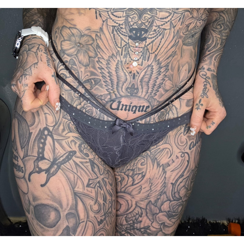 Dann schnapp Dir jetzt meinen glitzernden String aus Spitze, der schon sehr alt ist und mittlerweile auch ein paar seiner Glitzersteinchen verliert.