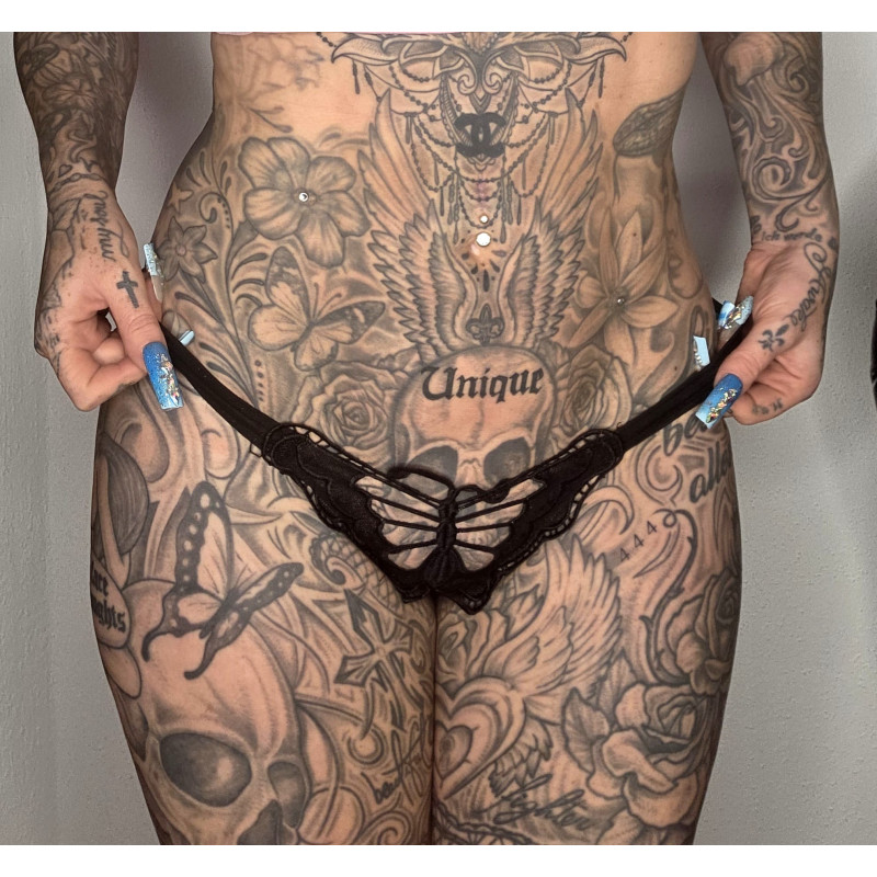 Dann schnapp Dir jetzt meinen schwarzen Tanga im Schmetterlingsdesign.