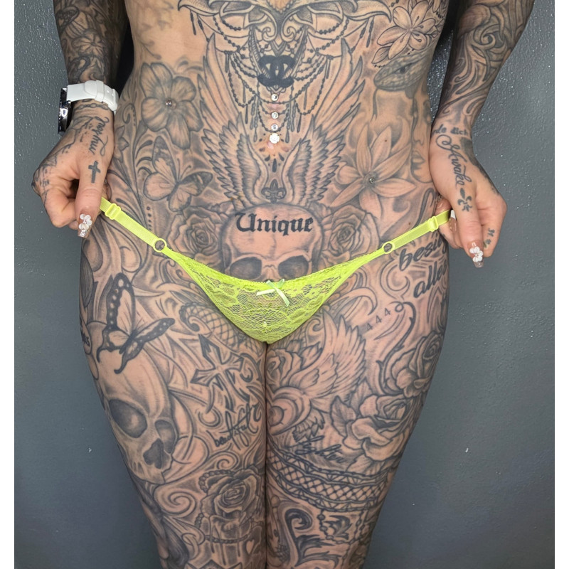 Dann schnapp Dir jetzt meinen neongrünen String aus Spitze, der aus besonders wenig Stoff besteht.