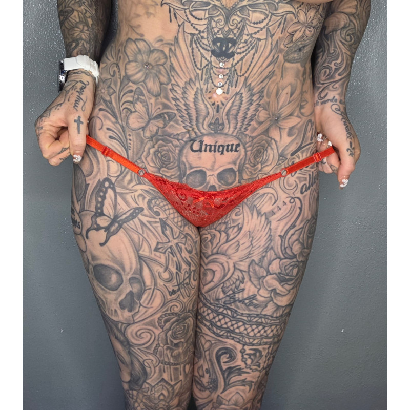 Dann schnapp Dir jetzt meinen roten String aus Spitze, der aus besonders wenig Stoff besteht.