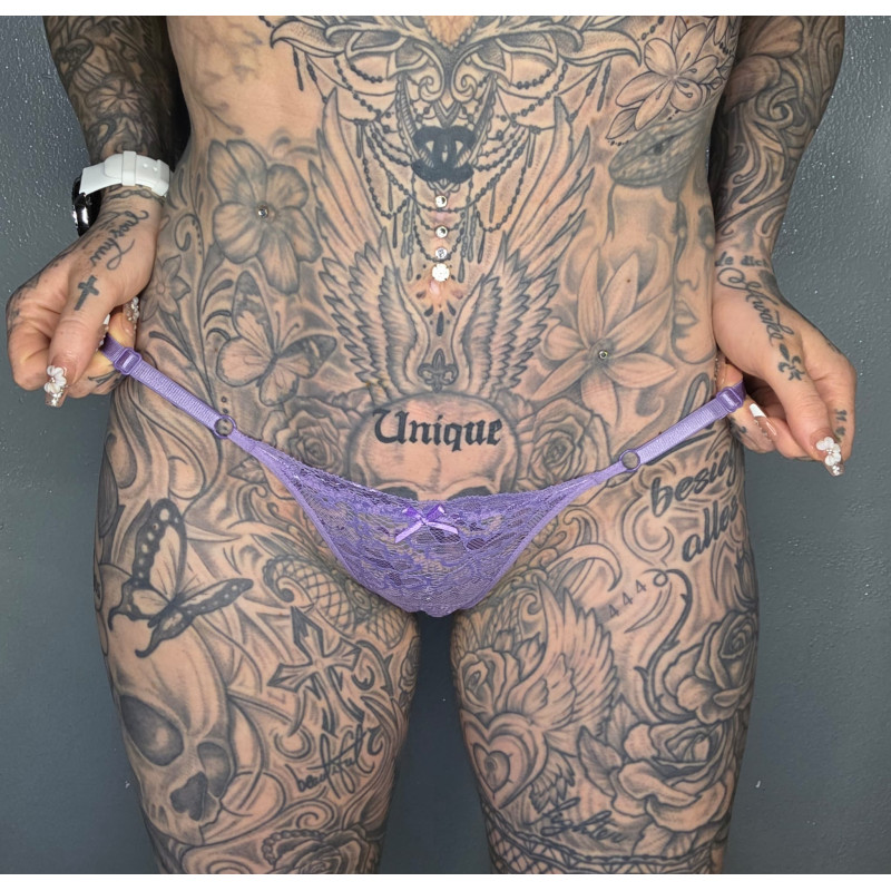 Dann schnapp Dir jetzt meinen Spitzen String in violett, der besonders viel Haut zeigt und nah an meiner Spalte liegt.